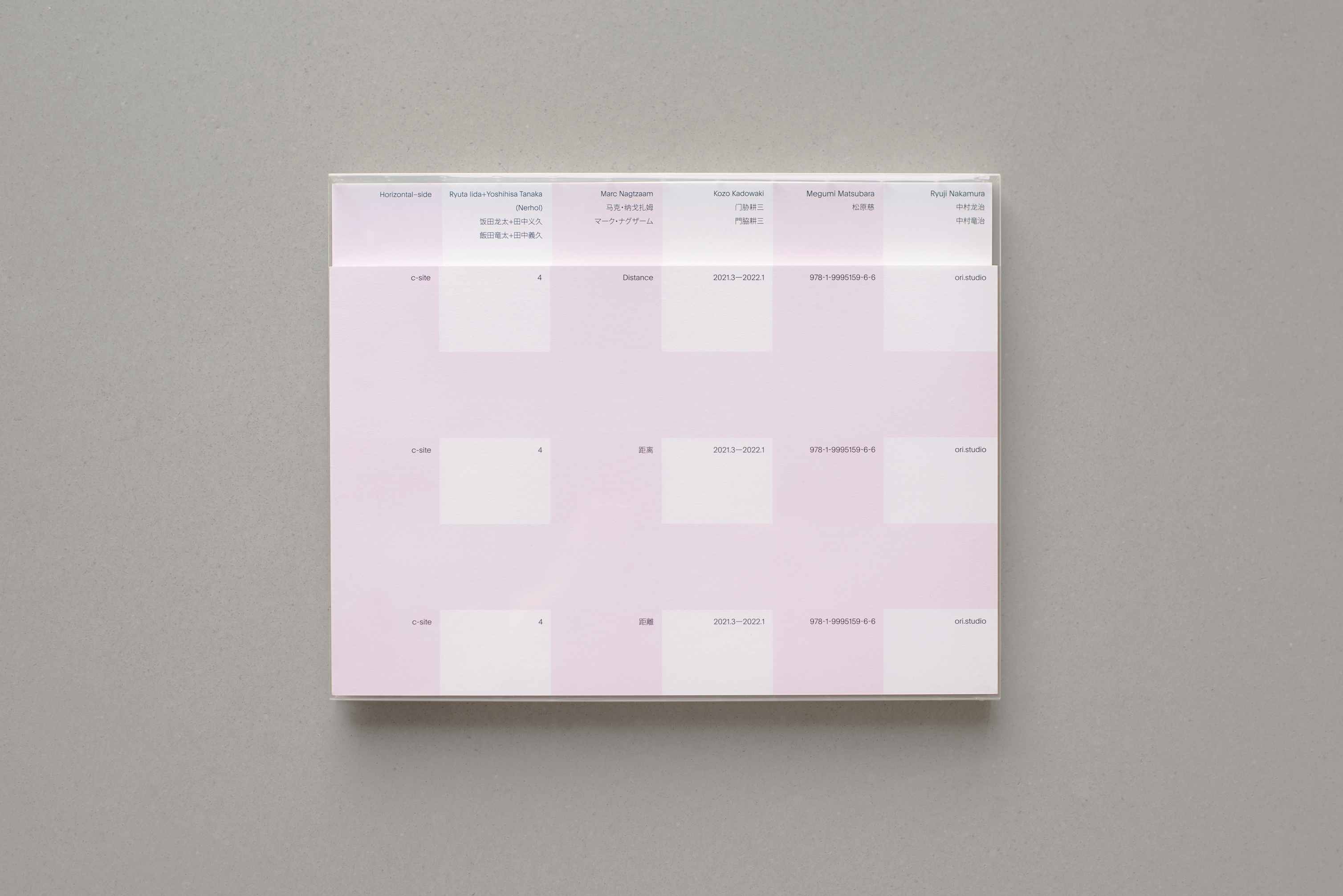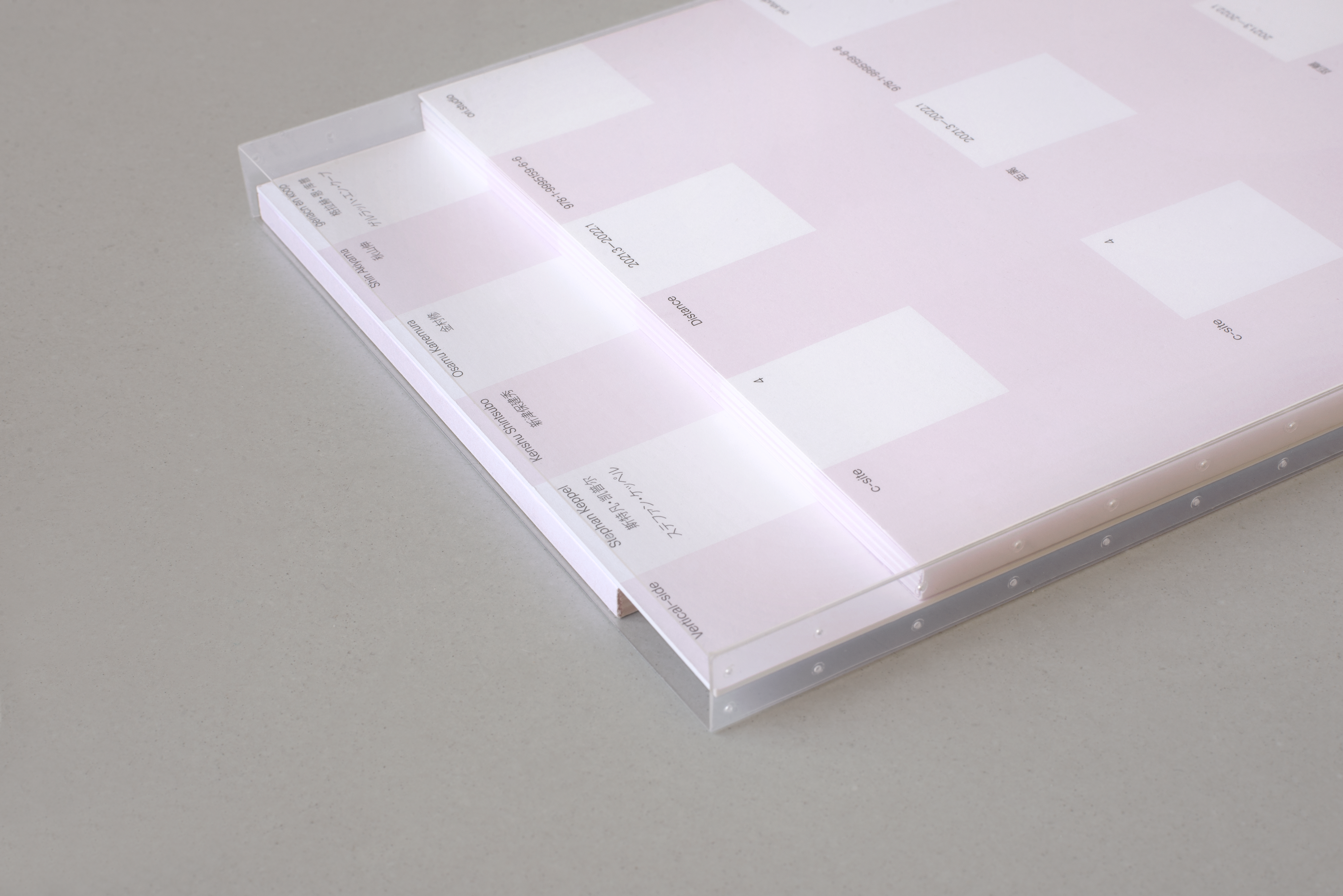 本書の対話では、 参加者の身元はお互いに明かされておらず、 対話が終了した時点で初めて明かされます。 これは「距離」の一例であり、 対話とテーマの関係性を生み出す境界線なのです。 このダイナミクスは本書のフォーマットにも表れています。 名前を記号化された10人の寄稿者が背中合わせで語るように、 本書は垂直と水平という対照的な方向性を持つ2つの部分が背中合わせに配置され、 物理的な境界線が両者を分けています。